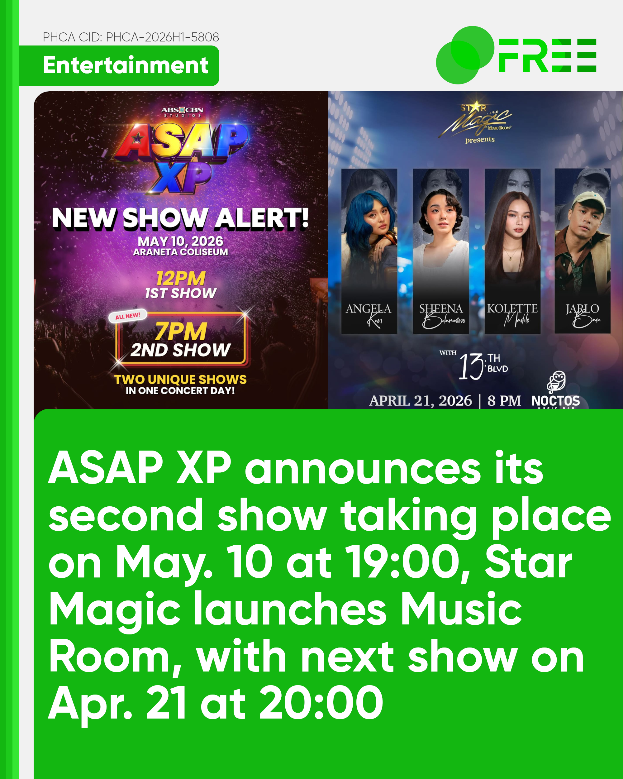 Meanwhile, Star Magic launches its own musical sessions at the Noctos Music Bar, situated in Quezon City, Metro Manila, for its Music Room Sessions. It kicked off on April 14, 2026, and offered fans intimate and up-close performances of KD Estrada, Christof Sommereux, and Kai Montinola, under the musical direction of James Philippe.