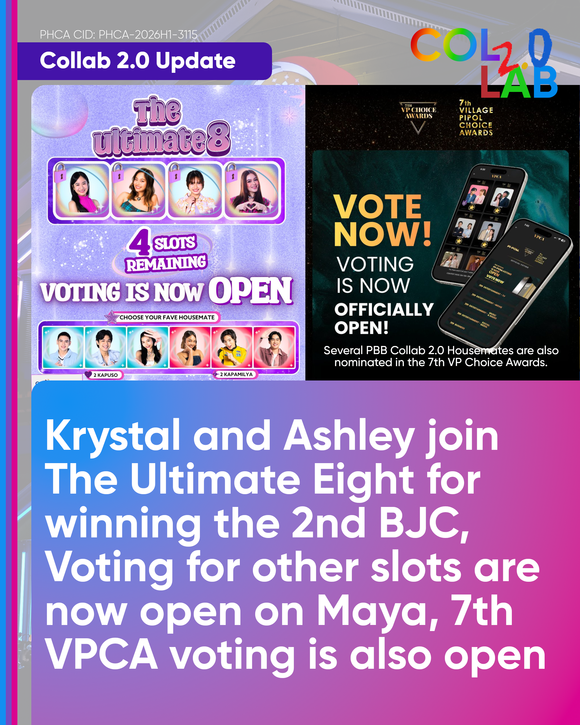 From there, viewers will have the power to vote on the Maya app for who among the six nominated housemates (Kapuso Housemates Heath, Marco, and Princess, and Kapamilya Housemates Carmelle, Joaquin, and Miguel) must be part of the other four vacant spots from the Ultimate Eight. The top two most-voted-for housemates from each agency will be part of The Ultimate Eight for The Big Night, while the third most-voted-for housemate will be the final evictee of PBB Celebrity Collab Edition 2.0.