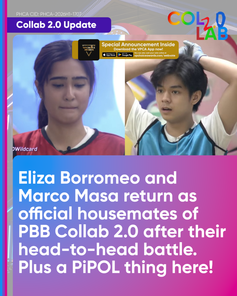 Hey there, mga Ka-Collab ng Bayan! After their intensive head-to-head battle of the Kapamilya and Kapuso wildcards following the reception of the top two most-voted ex-housemates of Pinoy Big Brother Celebrity Collab Edition (as implied in The Big Wildcard), Kapamilya ex-housemate-wildcard Eliza Borromeo and Kapuso ex-housemate-wildcard Marco Masa made their return inside the house as Official Housemates.