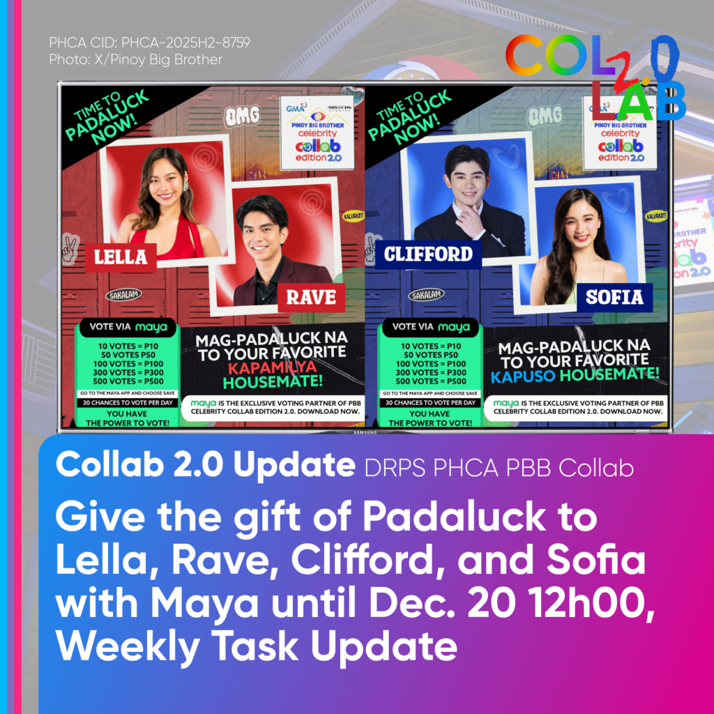It’s time to send a gift of Padaluck this Christmas to Lella Ford, Rave Victoria, Sofia Pablo, and John Clifford, Pinoy Big Brother: Celebrity Collab Edition 2.0’s current housemates, nominated for Padaluck voting on the Maya app, running until December 20, 2025, at 12:00 (Philippine Standard Time UTC+8).