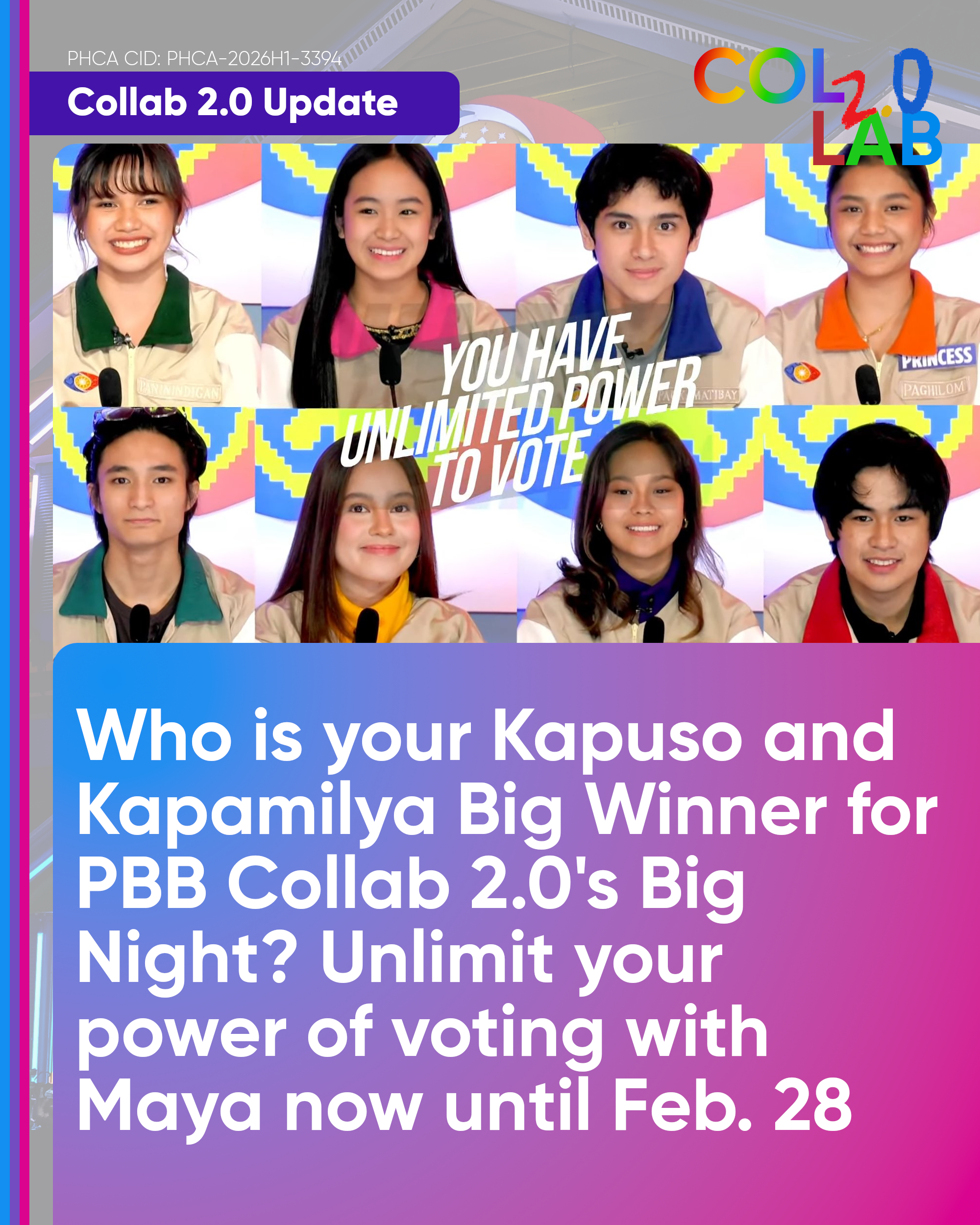 In less than a week, Pinoy Big Brother Celebrity Collab Edition 2.0 will proclaim the Kapuso and Kapamilya Big Winners in the Big Night. And because The Ultimate Eight Group has now formed on the 7th Eviction Night, following the simultaneous eviction of Carmelle Collado and Marco Masa, the unlimited voting power on the Maya app will be in effect from February 22 to 28, 2026.