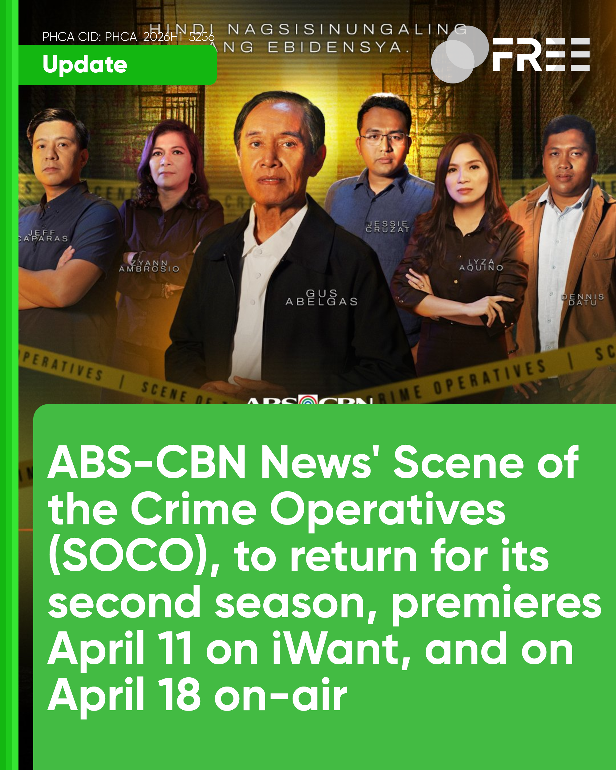The second season of the returning Kapamilya crime docu-drama series, SOCO: Scene of the Crime Operatives, is set to be released first on iWant on April 11, 2026, seven days before its on-air premiere on April 18, 2026, via Kapamilya Channel, Kapamilya Online Live, ALLTV2, and A2Z, at 17:00.