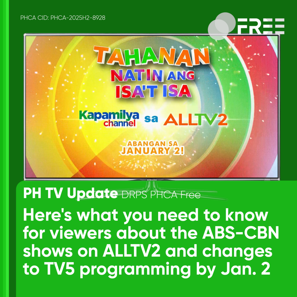 To reach out to all viewers of ABS-CBN’s well-loved shows regarding the move from TV5 to ALLTV2, effective January 2, 2026 (Friday), we’ve shared some important considerations for the programming changes on these affected channels from that date. This is a revised version as of December 26, 2025.