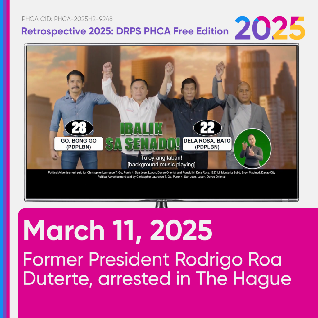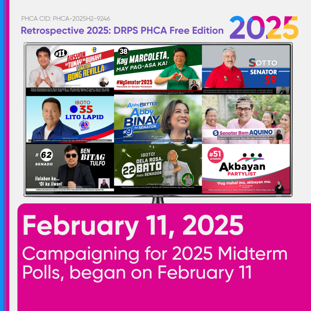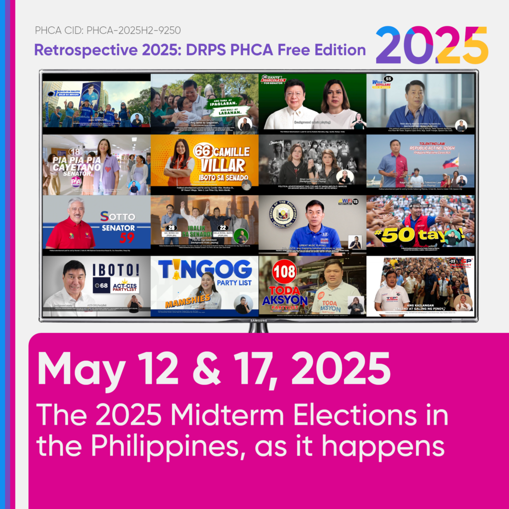 In Philippine Television, the first political TV ads from the candidates appeared on-air during commercial breaks. They were later shared publicly on DRPS One Channel’s YouTube, Facebook, and X/Twitter accounts, as part of the DRPS PHCA’s launch of “Politicalism 2025”.